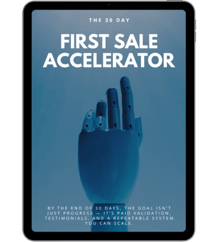 The 30-Day First Sale Accelerator is a step-by-step daily action roadmap that takes you from validated idea to your first paying customer in just 30 days. You’ll know exactly what to do each day.